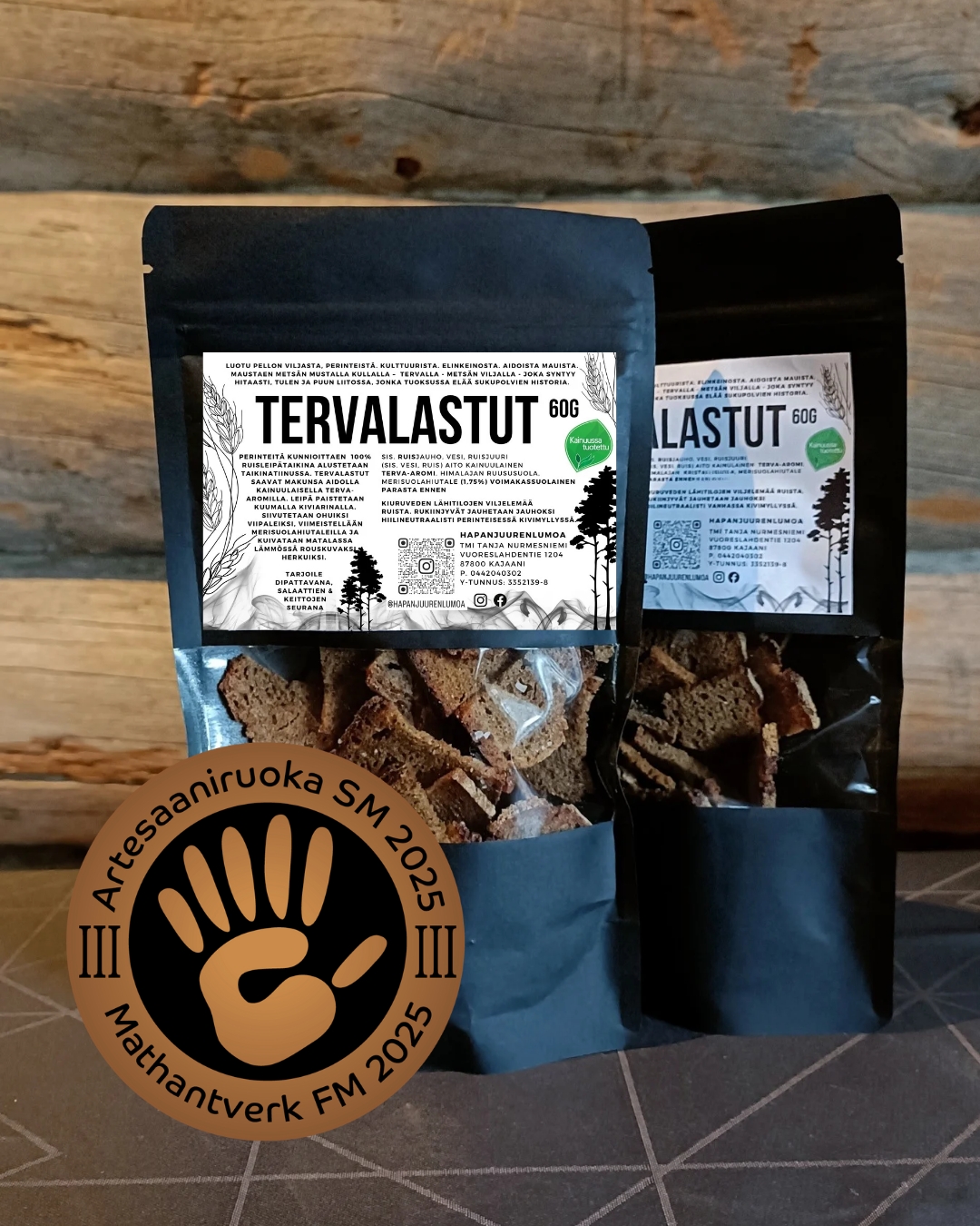 Artesaaniruoan SM-kilpailuissa 2025 snacks- ja välipalat -kategoriassa pronssilla palkitut Tervalastut. Rapeat Tervalastut valmistetaan 100% ruisleivästä, maustaen kainuulaisella terva-aromilla. Tarjoile rapeat artesaanileipälastut juustojen, salaattien tai keittojen seurana. Sopivat erinomaisesti myös sipsien sijaan dippailuun.